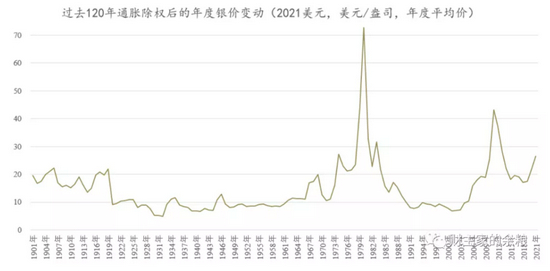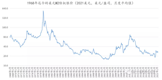 根据美国的官方通胀,对过去120年间的历史银价(年平均)进行除权;根据美元M2的供应量,对1968年以来的历史银价(月平均)进行除权。
