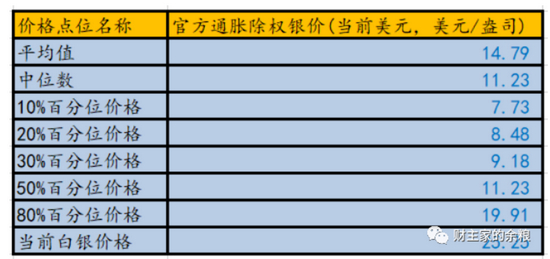 与黄金不同,白银的货币属性现在已经相当的弱,如果从普通金属的角度看待白银,用官方通胀率除权是可以接受的。有鉴于此,我列出了过去120年银价的平均值、中位数以及不同百分位的价格情况,以与当前的价格进行对比。