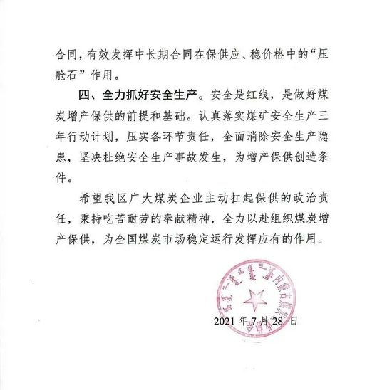 供应方面,停产煤矿复产仍然缓慢,内蒙古新批临时用地露天煤矿煤炭依然未能开采,供应吃紧。7月28日,内蒙古煤炭工业协会印发红头文件倡议书,呼吁内蒙古广大煤炭企业挖潜增产增供、努力稳定市场价格、切实提高合同履约率。