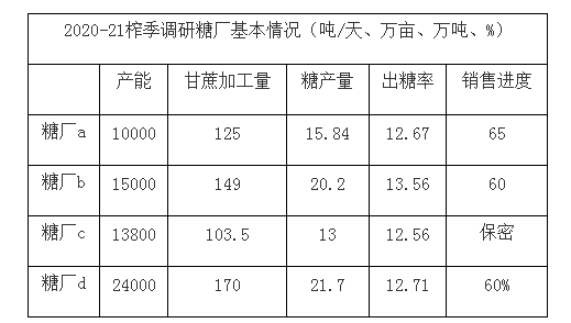从我们调研的四家糖厂情况看,2020-21榨季糖厂的生产情况是不错的,据介绍,其中的b糖厂相对表现更为突出一点。虽然b糖厂甘蔗加工量略有不足,只收购了149万吨甘蔗,但企业出糖率较高,达到了13.56%,所以企业的糖产量可以达到20.2万吨,企业经营情况算是比较好的。今年令企业担忧的是目前的销售进度,据我们了解,截至7月下旬多数企业的销售进度刚刚过了60%,而往年的这个时候企业正常都销售70%以上了,所以今年的销售压力会明显高于往年。
