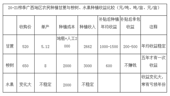 五、广西地区种植甘蔗与种植桉树、水果收益对比