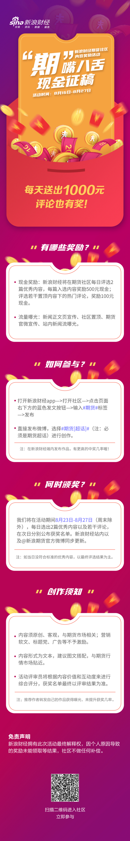 “期”嘴八舌,是新浪财经对社区创作者在【期货】栏目中内容贡献的奖励活动。活动期间,每天都送出1000元现金红包!我们会评选2名优秀创作者,每人颁发500元现金奖励!发布的内容要与大宗商品相关,并贴近期货市场行情。