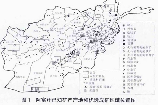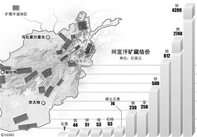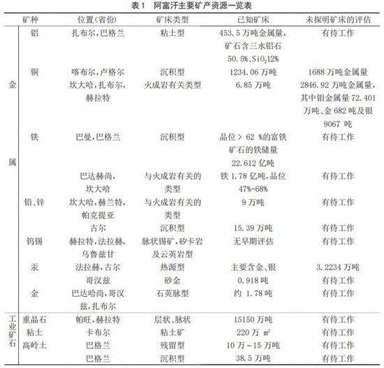 阿富汗的铜矿储量世界排名居前。美国地质调查局估算阿富汗铜矿资源约为 6000万吨,相当于全球的4%,分布在阿富汗中部的喀布尔铜矿区堪称是世界巨型矿区,面积超过800平方公里,该矿区由3个大型层状铜矿床(艾纳克铜矿床、达尔班德铜矿床及贾弗哈尔铜矿床)和94个类似的原生型铜矿(化)点构成,是现已探明的世界级巨型铜矿矿集区之一。