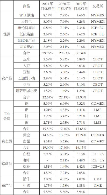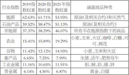 权重方面,S&P GSCI指数强调所纳入商品对于全球经济的重要性,重要程度越高,占指数权重越大。这种重要性取决于该商品以美元计量的总产值占纳入指数所有商品总产值的比重。从2021年S&P GSCI指数各成分品种的权重看,上述原则显露无疑,即能源类由于高产值与高流动性特点,其权重高达53.93%,远高于其他商品在指数中的占比。而在非能源类中,农产品占比为19.29%,工业金属占11.91%,畜产品占7.99%,贵金属仅占6.87%。尽管如此,相比于2020年,S&P GSCI指数在能源类的权重明显下降,而其他非能源品种的权重有了显著提升。
