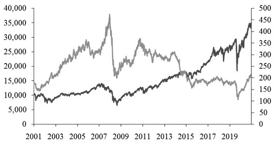 在经济周期的不同阶段,商品类资产与权益类资产往往有着不同的表现,大类资产组合通过对商品和权益类资产的合理配置,有利于改善资产的风险收益特性。2001年以来,路透CRB指数与道琼斯股指之间走势迥异,两者之间总体呈现出较强的负相关性。