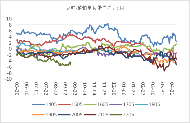 豆粕-菜粕期货价差:通过比较两者价差和单位蛋白差,发现成一致性趋势,价差在未来一个月季节性呈现季节性走强规律,所以,我们在操作上直接买豆粕卖菜粕2205。