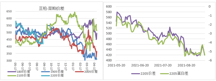截至9月14日收盘,豆粕-菜粕5月合约的单位蛋白差在-5.4元/吨(即1单位蛋白用菜粕比豆粕贵5.4元),价差为420,处于历史比较低的位置,做多的安全边际较高,豆粕的单位蛋白性价比高于菜粕,将逐步会出现豆粕替代菜粕的现象。基本面上,目前豆菜粕现货价格坚挺,基差偏强,期价震荡偏强预期强,未来两个月大豆到港量预期有所下降,库存预期下降,养殖需求补库,豆粕将季节性去库,而菜粕的水产需求旺季快要结束,同时价差有很强的季节性走强规律,可以考虑进行买豆粕卖菜粕2205策略,可加强滚动操作以博取震荡收益。