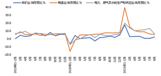需要说明的是,除需求走弱这一核心拖累因素外,8月工业生产也受到疫情防控等短期因素扰动,同时环保限产、芯片等关键原材料短缺、上游商品涨价挤压利润空间等供给侧不利因素的影响也依然存在,从而加大了当月工业增加值增速的下滑幅度。