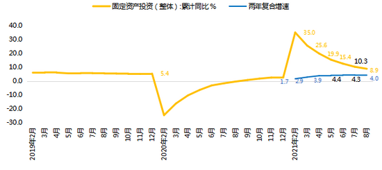 1-8月固定资产投资同比增长8.9%,随上年基数抬高,增速延续年初以来的回落势头。为消除上年低基数影响,以能准确体现固定资产投资修复进度的两年平均增速衡量,1-8月的两年平均增速为4.0%,较前值下滑0.3个百分点,为连续第二个月下行,且明显低于疫情前的增长水平。