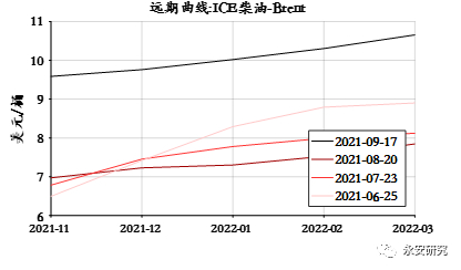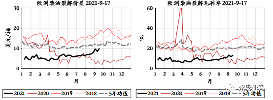 今年以来,欧洲柴油裂解价差始终低位运行,截至9月17日,欧洲柴油裂解价差为9.59美元/桶(周+0.24,月+1.73),历史分位数仅为29%,远低于2018、2019年的13.16、16.88美元/桶。当前欧洲柴油裂解价差为Contango结构,部分体现了远月看涨预期。如果以2019年的柴油裂解价差作为估值上限,则11月和12月合约的上行空间分别为7.29、7.27美元/桶,盈亏比较高。此处未对比2020年的柴油裂解价差,因2020年全球遭遇新冠疫情,经济活动大幅放缓,柴油需求降低,叠加沙特开启全球价格战导致原油及成品油供应大幅增加,导致柴油裂解价差处于极低水平。