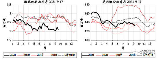 2、西北欧柴油库存为224万吨,大幅低于5年均值288万吨,且将于10月中上旬开启季节性去库。