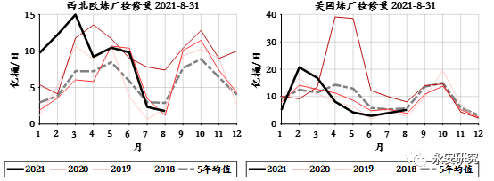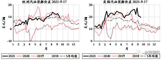 近期的柴油裂解价差持续上行,部分受到美国墨西哥湾地区油品供应紧张的影响,截至9月17日,美湾仍有30%的原油产能处于关闭状态(飓风“艾达”的影响),油品供应恢复缓慢。