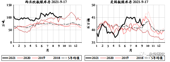 今年4月以来,欧洲柴油库存持续低位(部分因疫情后的需求恢复),且即将迎来季节性去库,将继续支撑柴油价格。截至9月17日,西北欧柴油库存为209万吨,大幅低于5年均值288万吨,欧洲柴油库存将于10月中上旬开启季节性去库。美国馏分油库存与2018、2019年的水平相当,大幅低于2020年水平,且将于9月中下旬迎来季节性去库。
