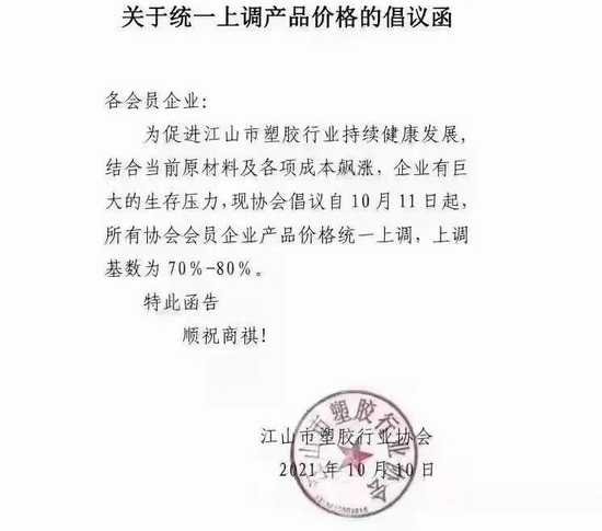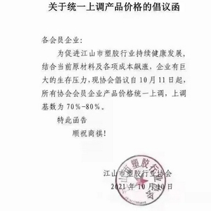 就在昨天,江山市市塑胶行业发布关于上调产业价格的倡议函,函中指出,为促进江山市塑胶行业持续健康发展,结合当前原材料及各项成本飙涨,企业有巨大的生产压力,现协会倡议自10月11日起,所有协会会员企业产业价格统一上调,上调基数为70%—80%。
