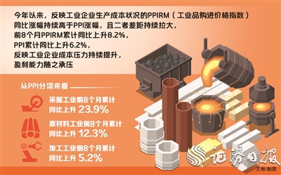 今年以来,反映工业企业生产成本状况的PPIRM(工业品购进价格指数)同比涨幅持续高于PPI涨幅,且二者差距持续拉大,前8个月PPIRM累计同比上升8.2%,PPI累计同比上升6.2%,反映工业企业成本压力持续提升,盈利能力随之承压。从PPI分项来看,采掘工业、原材料工业和加工工业前8个月累计同比分别上升23.9%、12.3%和5.2%,显示工业品通胀压力主要集中在上游。