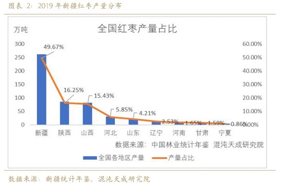 全国红枣看新疆,新疆红枣产量占比约50%。新疆、陕西、陕西、河北、山东地区总产量占比约90%。