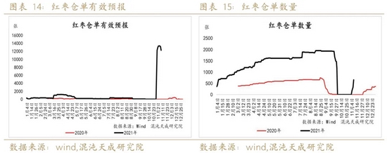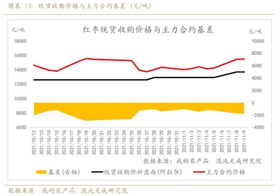 3、 目前主产区统货主流收购价格7-8.5元/公斤,折算仓单成本是13200-14900元/吨。重点关注产区收购价格变动,今年新疆核桃减产也出现抢购情况,不排除在产量明晰后,红枣收购价格继续上涨可能。红枣需求具有明显的季节性规律,需求端开始逐步进入旺季,销区现货的启动可能仍需要一段时间发酵,远月合约是比较好的做多标的。