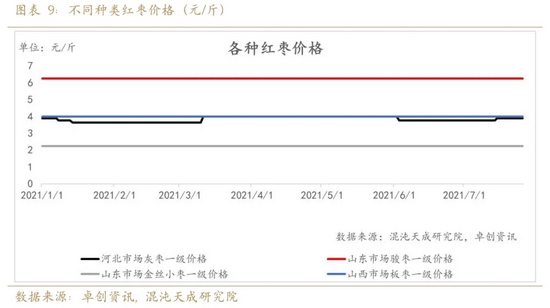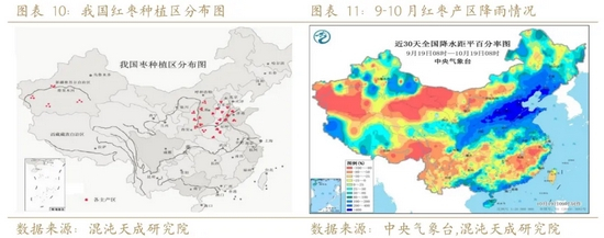2、 根据新疆农业产业化大数据,2021年阿克苏和阿拉尔管理种植面积缩减18.4%,以及干热风、缺水造成单产下降20%-30%,我们预估2021/2022作物年度新疆红枣产量环比下降30%。另外,次生产区陕西、山西、河北均存在减产,预估全国减产30%。