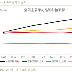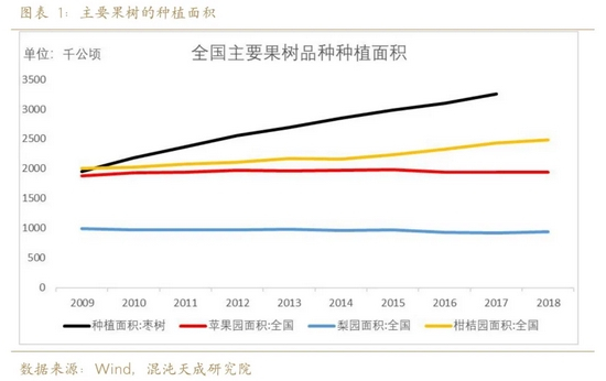 中国作为枣的原产国,是世界上枣种植面积最大的生产国,枣树是我国第一大干果树种和最具民族代表性的果树之一,枣树比一般果树提前1~3年挂果,具有连续开花、高产的能力,枣树的经济寿命大约60~80年,而树体寿命长达200~300年以上。如图所示,过去10年来【2008-2017】我国枣园面积快速增长,年平均增速达到6.6%,柑桔园面积年平均增速也达到2.3%,苹果园和梨园的面积则相对维持稳定。