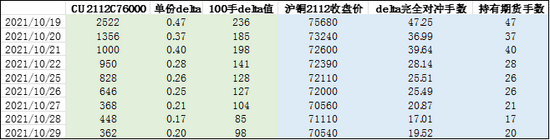 我们具体的操作方法是,当观察到铜期权隐含波动率在18日冲高达到30%以上后,我们决定在19日收盘时以2,522每份的价格,卖出100手沪铜2112合约看涨76000期权(盘中平值附近的期权)。同时,我们在收盘时以75,680元的收盘价,买入对应delta中性数量的沪铜2112期货合约。举例来说,19日收盘时期权合约单份的delta值约为0.47,因此我们卖出100手期权合约的delta值约为236,因此,我们选择买入47手的铜2112期货对冲,维持delta中性。我们在每日收盘时会对整个组合头寸的delta值进行调整,假设每日的调整价格为收盘价。