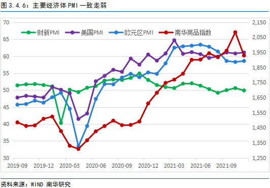 中国财新PMI在2020年11月份录得54.9的高位,美国PMI在今年3月录得64.7的高位,欧元区PMI则是最晚,在今年月录得63.4的高位。之后,三个主要经济体PMI都出现震荡下滑。财新PMI当前在50附近,8月份还录得49.2,跌破50荣枯分界线;美国PMI依然处于60附近的高位,7、8月份也曾跌穿过60;欧元区PMI高位录得最晚,但是下滑幅度较猛,已经连续三个月处于58附近的水平。根据中国经验以及欧美过往历史,欧美PMI震荡往下的走势是大概率事件,欧元区的下滑速率往往会快于美国,甚至会快过中国。南华商品指数在其拖累之下,也将逐步步入下行趋势之中。
