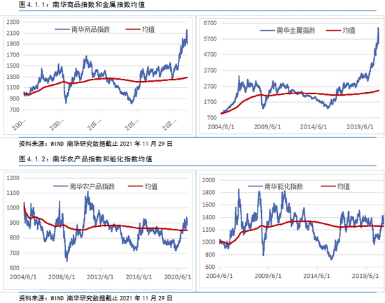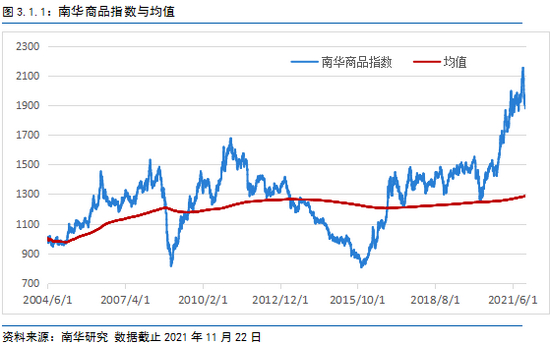 南华商品指数从2004年6月1日编制起始,到当前2021年12月,已经走过了近17年多的历程,记录了这段时间以来中国商品市场的跌宕起伏。从图中可以发现,2021年之前,不管价格如何变动,南华商品综合指数始终处于一个区间(800,1700)之间波动,南华商品综合指数均值一直处于区间(1200,1270)之间窄幅波动。如果把南华商品综合指数走势看成南华商品综合指数所代表的一众大宗商品的价格,则南华商品综合指数均值则代表着一众大宗商品的价值。2020年,一季度,南华商品指数实现均值回归,但是没有跌破。2季度,中国对疫情的有力管控,复产复工全面铺开,大宗商品需求爆发性增长;但是供给端,由于国外疫情则是迅速发展和蔓延,停工停产持续发生,导致部分大宗商品供给端出现问题;供应遇阻,需求爆发,叠加各国大量流动性的注入,整个大宗商品市场出现持续性的上涨行情,这种上涨一直持续到三季度末。南华商品指数也迎来了一波强有力的反弹,9月1日触及1529.5高位,距离1月份高点已经不到26点。四季度,疫苗顺利推进叠加美国总统选举,市场乐观情绪再度点燃,南华商品指数继续走强,突破一季度高点,在12月底创出新高1692点。进入2021年,宏观面美国新任总统拜登推出1.9万亿美元的救助计划,中国节后流动性相对宽裕;行业方面,沙特意外的维持原油减产计划,助推原油及下游油化工大涨,原油上涨引发市场做多热情,黑色和有色在资金和情绪双重推动下,不断上扬。南华商品指数上沿被持续打破,并在5月12日创出新高1995.5点,之后市场进入高位震荡。7月份,一张发改委关于各个地区的能耗预警图引发市场关注,部分地区发电量大幅上涨,耗煤量快速上升,动力煤价格飙升,发电厂出现亏损,发电意愿大幅下降。动力煤价格上涨引发一系列与之相关商品跟随,限产导致供应端大幅减少,惜售、投机风潮显现,期现互动,推动价格上涨形成“正反馈”,部分品种进入暴涨状态,并带动南华商品指数再度创出新高2128。10月份,在国家强力行政干预之下,动力煤价格出现雪崩,相关商品也大幅下挫,部分商品价格跌幅超过50%,南华商品指数重新回到前期高位横盘区域。