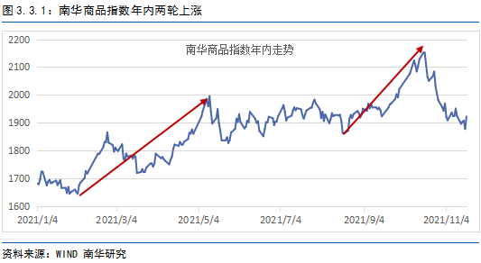 在我们今年的季报以及半年报中,都认为南华商品指数处于高位,半年报题目为物极必反,三季度报告题目为潮起潮落,市场后来的走势与我们之前的判断非常一致。对于南华商品指数已经从上涨趋势转为下跌趋势,这个在市场中已经形成了较为一致的观点,那么未来商品指数会以什么路径开启下跌之旅,这个目前还没有形成共识。本文将首先回顾今年主要几波上涨驱动,之后再来分析明年商品指数将如何运行。