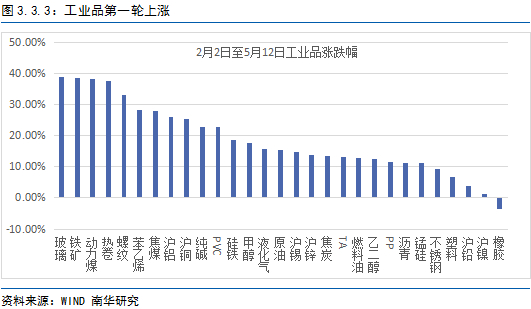 分商品来看,在统计的29个活跃工业品中,28个都是上涨,只有橡胶下跌。从幅度上看,涨幅超过20%的品种有11个,涨幅超过10%的品种有24个,本轮上涨属于典型的宏观强力因素驱动的普涨。从板块上看,黑色板块涨幅最大,有色居中,化工最小,也表明地产对于本轮贡献最大,出口韧性托底整个工业品。