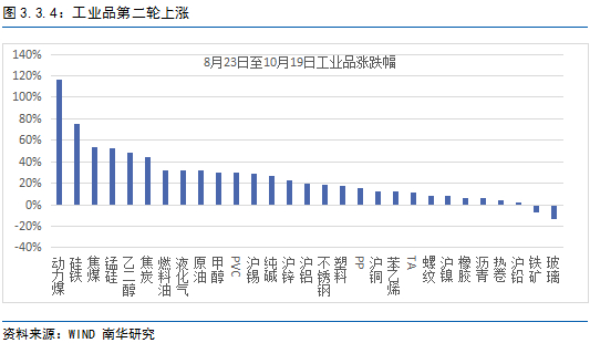 第六段:2020.1.9—2021.10.19。考虑到南华商品综合指数已经从1月份的最高点大幅下挫,从最高点1548.29至最低点位1274.33,下跌点数达到274点,下跌幅度为17.69%。尽管下跌幅度没有达到20%。疫情的出现,打乱了大宗商品的节奏。主要经济体刺激政策出台,叠加供应端的扰动,南华商品指数从4月初开始,启动新一轮上涨行情,本轮行情一直延续到今年的10月19日。期间,出现两次高点,第一次高点出现在今年5月12日,这个高点我们称之为宏观和流动性高点;第二次高点出现在今年10月19日,这个高点我们称之为供应端高点,此次高点出现也预示着本轮上涨行情的结束。