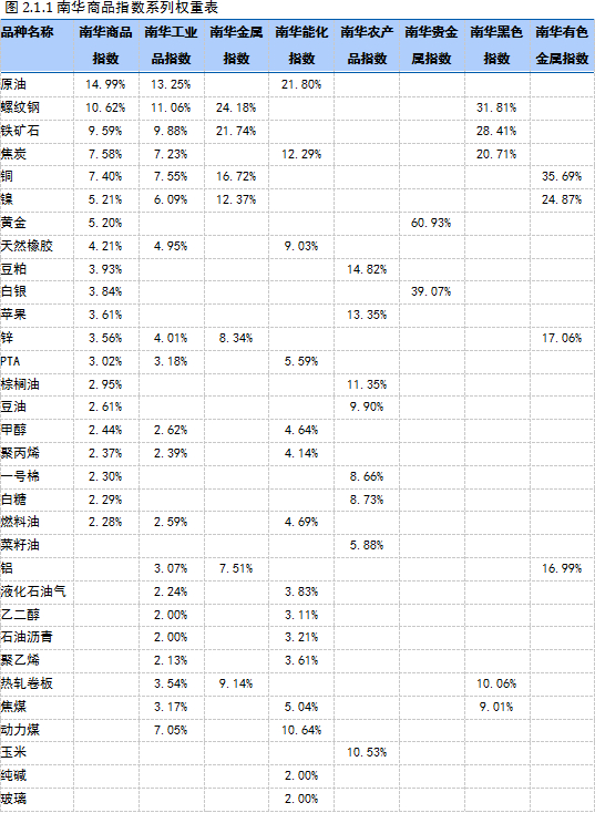 南华商品指数选择三大交易所上市品种中代表性较强且具有较好流动性的商品来进行编制,涵盖农产品、金属、贵金属以及能源化工等大类,此外,整个指数系列还包括单个商品指数、分类商品指数和南华综合指数等。