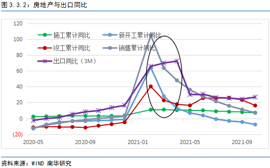 由于“三道红线”政策、个人住房贷款额度管理、以及房贷利率的不断调升,房地产商资金面临压力,伴随着利率的逐步抬升,房屋销售也快速下滑,往年的“金九银十”旺季不旺,10月份同比销售增长7.3%,跌入个位数增长。销售下滑拖累房地产商资金回笼,资金面进一步恶化,部分地产商选择“躺平”,资金的恶化使得地产商没有足够的资金竞购土地,新开工负增长进一步扩大,市场进入“负反馈”。房地产行业与大宗商品牵涉甚广,很多商品消费都依赖于房地产行业,地产如果持续偏弱运行,商品必然进一步走弱。