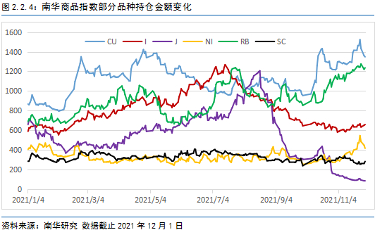 通过对比可以发现,四种国际商品指数所包含的商品期货品种大同小异,主要的区别表现在权重方面。相比之下,南华商品指数包含了很多中国国内特有的品种,如TA、苹果等,与其他四种商品指数有较大差异。从今年几大商品指数走势看,都比较接近,整体呈现波动上涨走势。今年由于原油上涨比较强势,国外商品指数一直运行在南华商品指数上方。10月份之后,国内对于动力煤的管控,南华商品指数快速下滑,国外商品指数继续高位波动。11月25日,新冠变异病毒“奥密克戎”出现,原油出现大幅跳水,国外几大指数也是直线下跌,南华商品指数只是小幅下滑。考虑到原油走势的滞后性,以及国内房地产市场的继续走弱,明年南华商品指数或许依然处于国外商品指数下方。