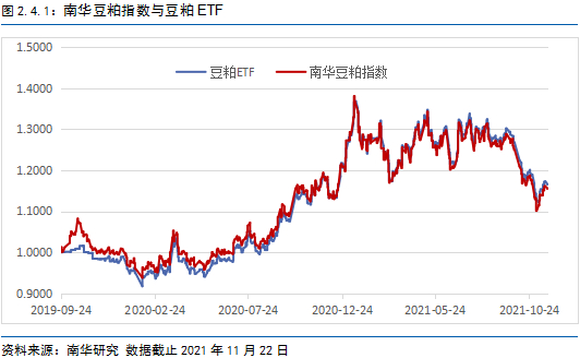 豆粕ETF2019年9月24日基金净值为1,将南华豆粕指数也归为1,截止2021年11月22日,豆粕ETF净值为1.1660,南华豆粕指数收益为1.1556。从下图对比来看,两者走势在基金刚成立的一年左右时间内有一些差异,但是随着时间推移,两者走势基本趋同。