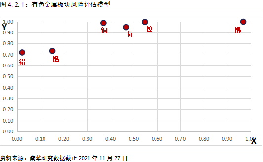 首先关注南华金属板块,南华金属板块包括南华有色金属和南华黑色金属等品种。从有色板块看,纵向对比Y基本处于0.6上方,表明当前有色金属整体估值处于高位。铜、锌、锡和镍相对于铅、铝而言,估值相对偏高。尽管很多品种高点已经出现,并出现部分下跌,但是从估值上看,仍然处于偏高位置。锡由于供应偏紧,需求旺盛,表现最为强势,关注明年基本面变化;锌依然受锌精矿扰动,短期依然偏强,关注锌精矿加工费什么时候转向。铜受宏观影响更大,在美国收缩期间,下跌的可能性更大。