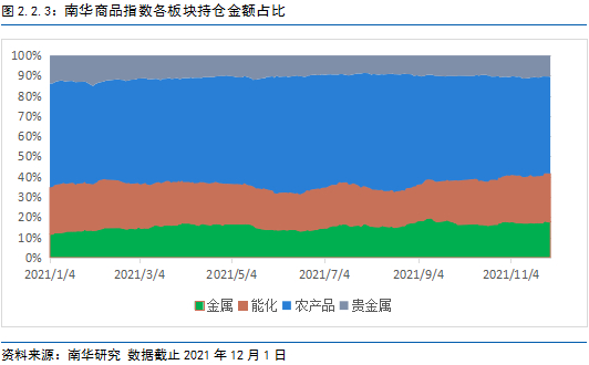 从持仓金额占比来看,全年波动还是较大。金属板块持仓金额占比持续上涨,从年初的11%左右上涨至年底的17.85%;相比之下,农产品板块和贵金属板块持仓金额占比则是快速下滑,农产品板块从年初的51.46%降至47.91%,贵金属板块从年初的13.86%降至10.53%;能化板块持仓金额占比则是先减后增,总体波动不大,从年初的23.07%小幅增至23.71%。