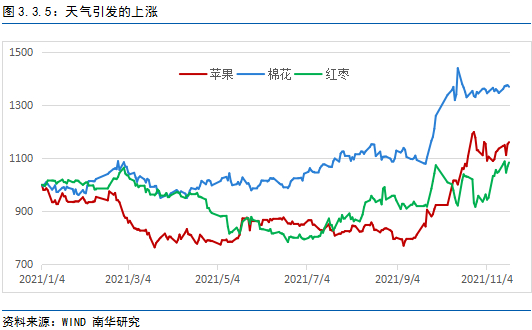 除了工业品的两轮上涨之外,农产品本年有些品种表现也非常不错。油脂类在低库存和高升水的背景下,本年度一直走势强劲,即使行情走到当前时间点,也未见走弱迹象。另外,由于今年天气的问题,直接推动三个品种出现较大机会,分别是红枣、苹果和棉花。这三个品种生产区都处于大西北,受天气的影响较大。苹果和红枣由于前一年丰产,价格出现持续走低,所有利空都已经反映在价格之