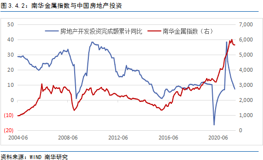 南华商品指数包含来自于金属、能化、贵金属和农产品等板块的指数,南华金属板块占比一直都比较大,南华金属指数包括有色板块和黑色板块,这两个板块的品种与中国房地产行业发展密切相关,而房地产属于资金密集型行业,房地产开发投资完成额与南华金属指数走势有非常密切的协同关系。