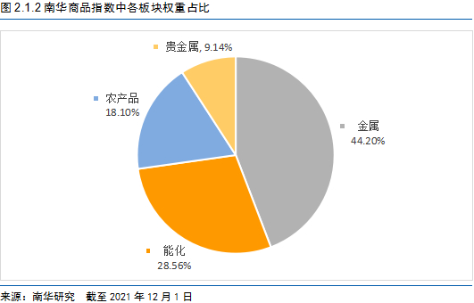2021年6月1日,按照《南华商品指数编制细则》的规定,我们对南华商品指数的品种及其权重进行了定期调整,根据品种在之前五个年度的交易金额和消费金额数据,对每个成分品种赋予新的权重。南华商品指数目前权重分布如下: