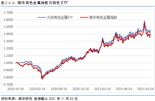 大成有色金属期货ETF于2019年10月24日成立,2019年12月24日上市。首发募集资金3.11亿元。基金成立后,采取了分品种、合约逐步建仓的策略,先期配置权重相对较重的沪铜和价格弹性较小的沪铝合约。基金对比业绩基准上期有色金属期货价格指数IMCI。对比有色ETF和南华有色金属指数,截止11月22日,有色ETF净值为1.4428,南华有色金属指数为1.3934。从趋势上看,两者走势基本保持一致,有色ETF一直维持在南华有色金属指数上方,基金报告显示,基金成立后,恰逢有色金属期货价格指数IMCI处于下跌调整期,基于市场状况,基金采取分品种、合约逐步建仓的策略,一定程度上奠定了对基金业绩基准偏离的基础。