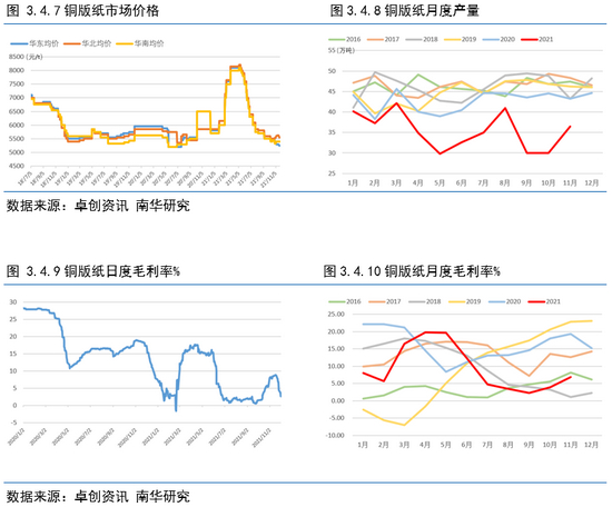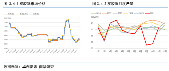 下半年文化用纸在出版订单陆续收尾后,社会订单疲弱,需求不足,市场供需矛盾凸显,市场价格逐渐回归供需基本面,价格大幅回落至年内低位,政策面受到“双减”的影响,市场需求大幅度缩水。截至11月底,157g 铜版纸均价为5390元/吨,较上月上调 2.20%,70g双胶纸市场均价为5408元/吨,较上月上调 2.10%;70g 木浆双胶纸市场均价 5542 元/吨,较上月上调 3.27%。铜版纸预计 12 月铜板纸市场价格偏弱运行;2022年1月促销力度减小,市场重心或略有回调,加之临近春节假期,价格主流盘整,2 月适逢春节假期,工厂或有停机检修情况,供应压力有所缓解,市场整理,重点关注需求恢复情况。双胶纸预12月价格重心震荡下行。2022年1-2 月适逢春节假期前后,市场交投更为清淡,业者操盘积极性进一步减弱,预计市场多整理为主,同时纸厂有停机检修可能,供应面压力放缓,价格有小幅上调可能。