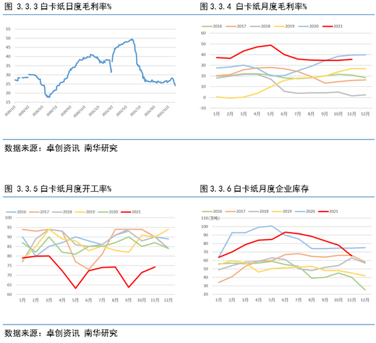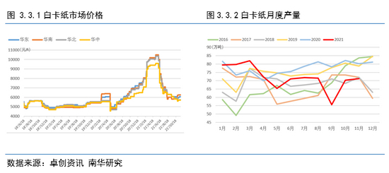 2021 年上半年,白卡纸市场走势倒“U”字形,4月为分界点,大致分为两部分 :1-4月上旬持续上涨,4月中旬后从弱势下滑到快速回落。白卡纸市场均价的最高点为4月上旬的9875元/吨,低点为6月底的6821元/吨,最高价与最低价之间的价差3054元/吨,波动幅度 31%。下半年白卡纸价格进入下行通道,主要是由于白卡纸下游需求恶化导致,纸厂多次提涨价格,但下游跟进乏力,落实效果不佳,市场订单偏刚需为主,客户拿货积极性不高。从整体需求上来看,202年下半年受中秋节等节假日旺季不旺的影响,下游订单量偏少。库存方面,纸厂的整体社会库存及企业库存于今年年中到达高点。从成本上来看,外盘报价持续走低,对白卡纸成本支撑有限。进入11月份,纸厂提涨心态增强。而春节前市场存在一波补货、赶工需求,11月下游拿货量存提升,带动纸价小幅上涨。随着广西地区180万吨产能的陆续释放,市场供需博弈,12月-2022年1月市场存在回落风险。