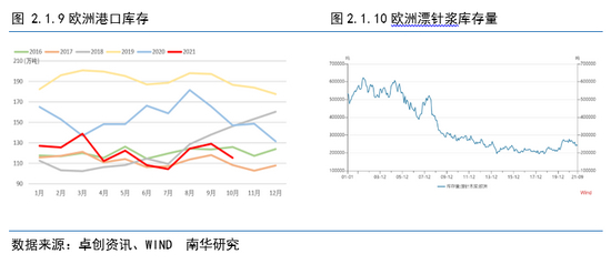 欧洲港口数据方面,2021年1-10月,港口库存累计为1206.67万吨,较去年同期下降了23.2%。随着海外疫情的有效控制,疫苗接种的普及度增加,人们回归工作单位、学校复课等商业和社会活动逐渐正常后,书写和办公用纸,以及部分广告印刷等用纸的需求也会有一定的恢复。另外,办公场所、商场、影剧院、机场等公共设施开放后,家庭以外的生活用纸消费也会明显增加。随着国外以消费为核心的经济体复苏,纸浆行业终端产品迎来一定的正向需求增长。
