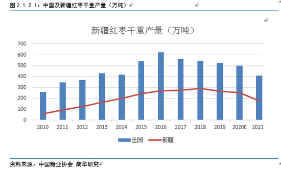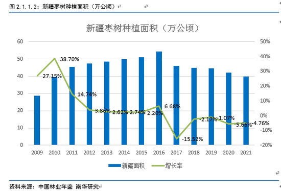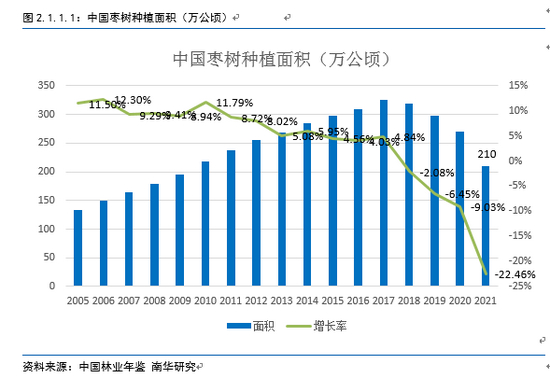 我国红枣的种植面积自2017年开始萎缩,2017年我国红枣的种植面积为325万公顷,到2020年面积下降至270.83万吨,而到2021年面积下降到了210万公顷。其中阿克苏地区的红枣面积从去年的40万亩大幅减少至30万亩,阿拉尔的红枣面积从去年的58万亩,下降至今年的50万亩。一方面,新疆红枣大量种植后,在市场遭遇很高的热捧,内地枣树的种植比重在逐年下降;另一方面,新疆产量增长后,枣价逐年下跌,经济效应下降,同时新疆地方有鼓励种植其他作物的政策,部分枣农为避免进一步损失,改种棉花、核桃、油桃、杏等其他经济作物。同时,从去年开始,枣树的行距也出现了明显的变化,以前红枣是矮化密植的,现在去掉了中间行,原本一亩地400多棵枣树,今年只剩下200棵,部分地方政府通过每亩地奖励1000元或者奖励化肥的机制来完成此项改种计划。我们估计今年新疆红枣改种面积可能在7%左右。