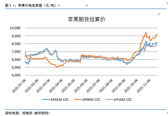 进入 2021 年后旧作苹果的库存一直处于历史高位,同时春节等节日效应的提也不及预期。造成这种情况的原因主要有两方面,物流方面,为了控制新冠疫情,物流受到了明显的限制。消费替代方面,柑橘、车厘子、哈密瓜等其他水果的价格较低,对苹果的需求冲击明显。因此2021的一季度期间,主力合约一直走势偏弱,绝对价格也创下了历史新低。3 月份,部分产区苹果进入花期,天气的变化成为主导盘面价格走势的关键,盘面先是在“倒春寒”天气的高发期之前按照以往的节奏围绕天气经行了炒作。然而拉升后,今年四月却整体气温偏高,苹果开花及坐果都没有收到霜冻的影响,围绕天气的炒作消退。从五月开始盘面交易的关注点转移到了需求方面,旧作苹果的库存高企,随着时间推移消费的支撑减弱,盘面在5月又开始震荡下行,直到9月旧作库存见底盘面的交易逻辑转向新季苹果。冰雹天气使得市场关注到了新季苹果质量较差的问题,情绪转向乐观后盘面连续拉升。尤其是新作苹果末期对应的2205合约拉伸至9000以上。