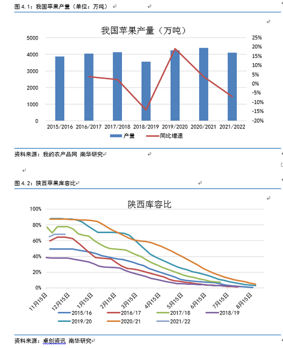 产量方面,目前的产量定调情况基本与前期套袋反映的情况趋同。在前期的套袋情况中,陕西延川、延长产区,套袋数量没有造成大规模减少,部分受冻果园套袋量同比去年变化不大,整体减产幅度控制在 5%-10%之间。就目前看来,陕西产区产量较预期有小幅下降,原因主要有以下几点:首先,咸阳产区由于近几年膜袋富士价格连续低于成本线,果农利润受损较重,种植积极性较差,造成砍伐弃种情况较为普遍;其次,天气因素对苹果影响较大,仍是咸阳产区在春季花期遭遇低温阴雨天气,影响授粉坐果。中期干旱天气导致陕西大部分地区果个整体偏小。除此之外,洛川、宜川、富县等地区遭受冰雹灾害,对产量也有轻微影响。延安产区整体套袋数量和正常年份接近,部分地区甚至出现套袋略有增加的情况。山东产区方面,栖霞东部整体情况较好,从套袋数量相比去年正常,部分果园套袋量稍有增加,整体变化不大。而蓬莱产区为山东减产最严重产区,主要原因是花期霜冻导致。优化后的山东地区产量有小幅上调,原因主要有以下几点:今年山东地区果径达到了往年的平均水平以上,栖霞西部苹果生长情况明显好于东部,莱阳、观里等地80#以上占比增多,果个偏大,一定程度弥补前期受霜冻产区影响。