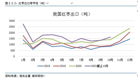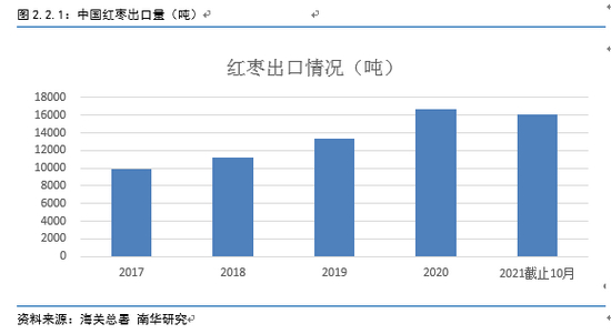 我国红枣主要是自产自销为主,没有进口,出口则很少,但呈现逐年递增的趋势。我国的红枣主要销售给东亚、东南亚,对象为华人。海关数据显示,截至2021年10月,我国今年红枣出口16136.22吨,同比增长29.79%。海外需求虽然比较好,后期也仍有进一步增长态势,但占比不足1%,因此无法有效带动红枣消费,对市场的影响较小。