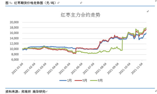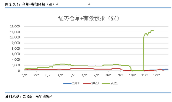 2021年红枣从供应过剩中走了出来,今年红枣产量下降幅度在20-30%,使得红枣价格大幅上涨70%,但是市场面临的问题在于往年还有大量陈枣,因此仓单数量的不断增加下,市场彰显出不缺货的状态。