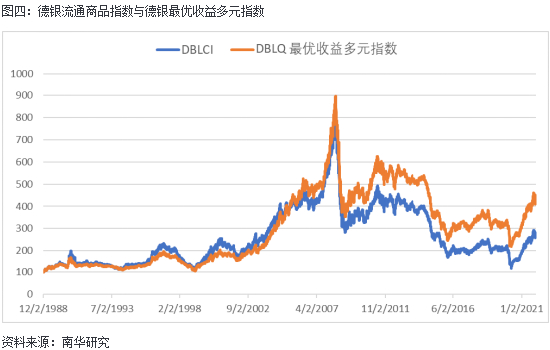 德银推出的展期变化指数是德银最优收益多元指数(DBIQ Optimum Yield Diversified Commodity Index)。该指数囊括来自能源、贵金属、工业金属、农业领域的14种商品,该指数通过选择隐含展期收益率最高的合约来最大化指数的潜在展期收益,以试图在backwardation市场中获利并减轻在contango市场中的损失。隐含展期收益率是由当前合约价格与待选展期合约价格的比值年化后计算而来,衡量了待选合约与当前合约之间的价格差异幅度,正如上文所分析的,隐含展期收益率越高,展期能为指数带来的贡献越大。