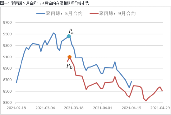 展期收益从概念上较好理解,在实际的交易中,展期带来的价格差异可以按两种方式理解。以聚丙烯为例,在2021年3月份聚丙烯5月合约价格高于9月合约价格,如果以 价格卖出5月合约再以 换入同等数量的9月合约,则直接获得 的收益。另一种理解方式是,如果卖出5月合约又将所有资金买入9月合约,则交易后并不直接获得收益,只是持有的合约数量出现了变化。相当于卖出 数量的5月合约,换为持有 数量的9月合约,由于 ,经过展期持有了更多的9月合约数量,相当于以较低的成本 获得了更多的多头敞口,将带来隐性的收益。无论以上何种理解,都可以将 与 之间的差额作为衡量新老合约展期收益的指标。