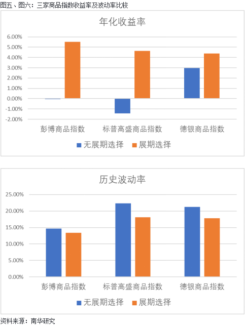 将上述提及的彭博、标普高盛、德银两类指数标记为无展期选择指数(BCOM彭博商品指数、S&PGSCI标普高盛商品指数、DBLCI德银流通商品指数)与进行展期选择的指数(BCOMRS彭博展期选择指数、S&PGSCI动态展期指数、DBLQ 德银最优收益多元指数),统计三家商品指数从各自的基期至今的年化收益率、历史波动率,对无展期选择类和展期选择类指数进行比较。对比结果可见进行展期选择后商品指数能有效提升收益率,并适当降低收益率方差。收益率的提高来自于对正向展期收益的选择倾向带来的收益提升。收益率方差的降低可理解为展期向后跨越选择合约,容易减少展期次数,降低指数日收益的波动幅度,同时backwardation结构下新合约上涨空间多,收益率更倾向于向上,波动会降低。综上进行展期选择可以提高商品指数的总体表现。